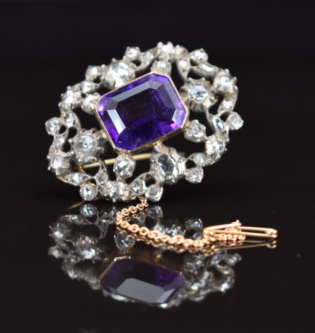 Victorian brooch set with an emerald cut amethyst surrounded by rose cut diamonds, 11.3g, 3.8 x 2.8cm