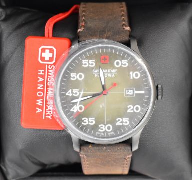 Two Hanowa Swiss military gentleman's wristwatches Champ ref. 6-4282 with date aperture, luminous hands and hour markers, blue dial, stainless steel case and quartz movement, on blue leather strap and Active Duty ref. 06-4326 with date aperture, luminous hands, white Arabic numerals, graduated dial, stainless steel case and quartz movement, on brown leather strap, both in original boxes with hang tag, international guarantee and outer box.