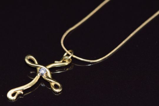 An 18ct gold cross pendant set with a diamond (2.7cm) on 18ct gold chain, 4.7g, 46cm