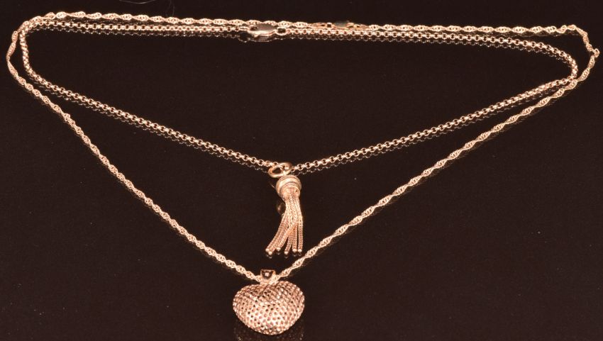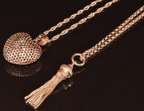 A 9ct rose gold chain with 9ct rose gold tassel pendant and a 9ct rose gold heart pendant on chain, 9.7g, 400 & 48cm