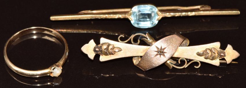 A yellow metal ring set with a pearl, Victorian 9ct gold brooch set with a diamond (Chester 1900) and a 9ct gold brooch, 6.4g