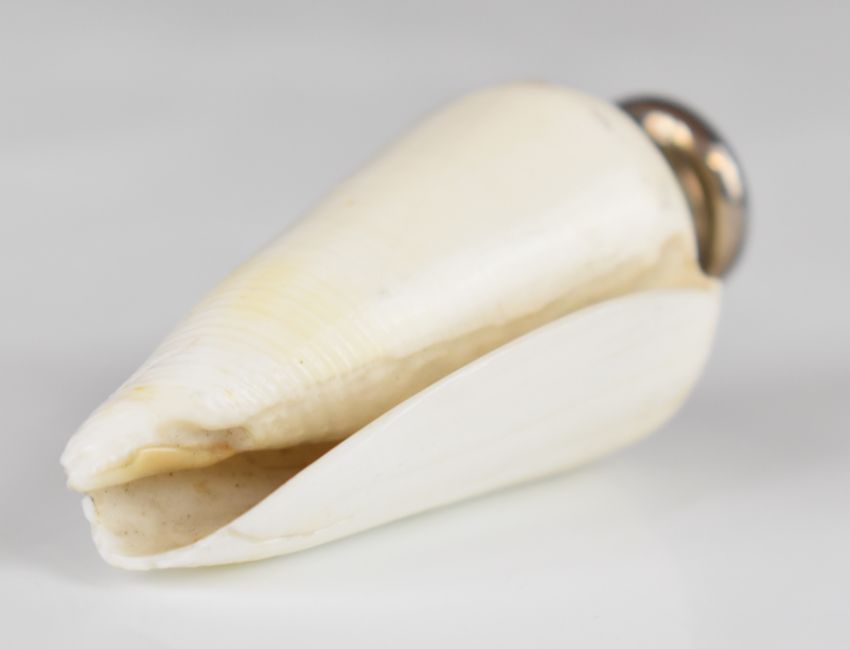 Sampson Mordan & Co novelty hallmarked silver mounted scent bottle, the body made from a white shell, London 1885, length 6.5cm