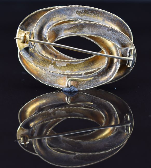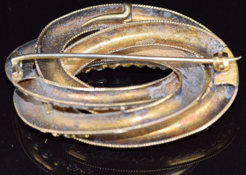 Victorian yellow metal knot brooch/ pendant set with split pearls and textured decoration, 12.9g, 5 x 3.5cm