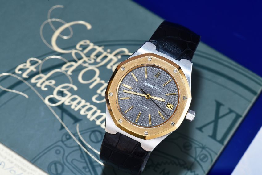 Audemars Piguet Royal Oak gentleman’s automatic wristwatch ref. 14800SA with date aperture, gold hands and baton hour markers, 18ct gold bezel, grey tapisserie or waffle dial, stainless steel case and 26 jewel calibre 2225 movement, on black alligator leather strap, case diameter 36mm, limited edition number 027, serial number D51849, in original box with warranty.