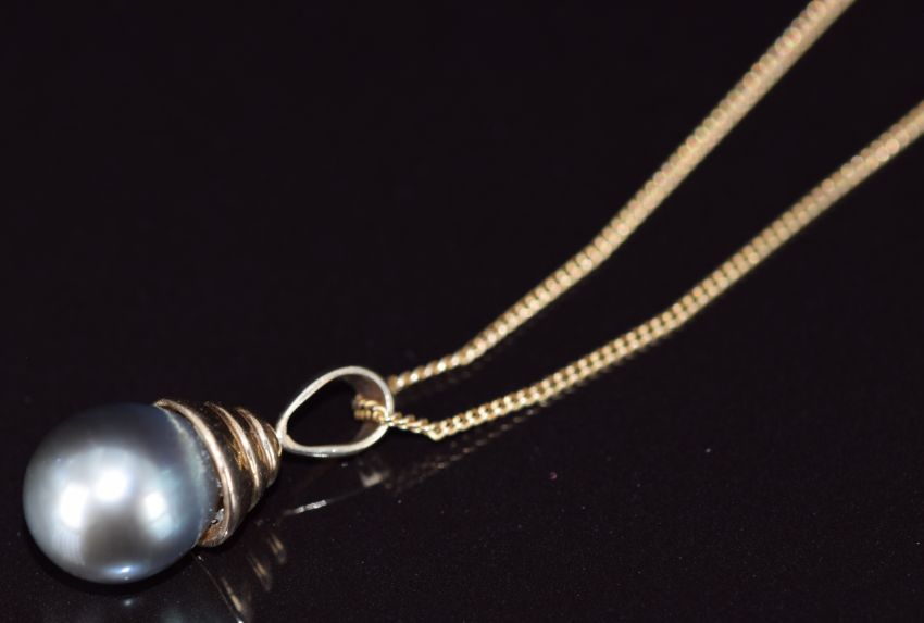 A 14k rose gold pendant set with a black pearl (3.3g, 10.5mm) on 9ct gold chain (2.1g)