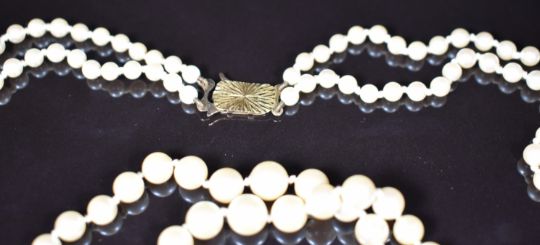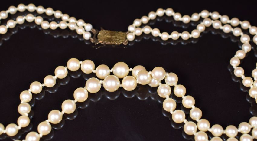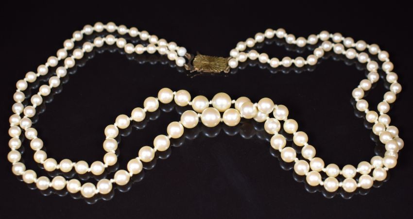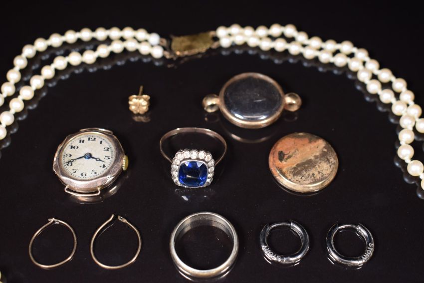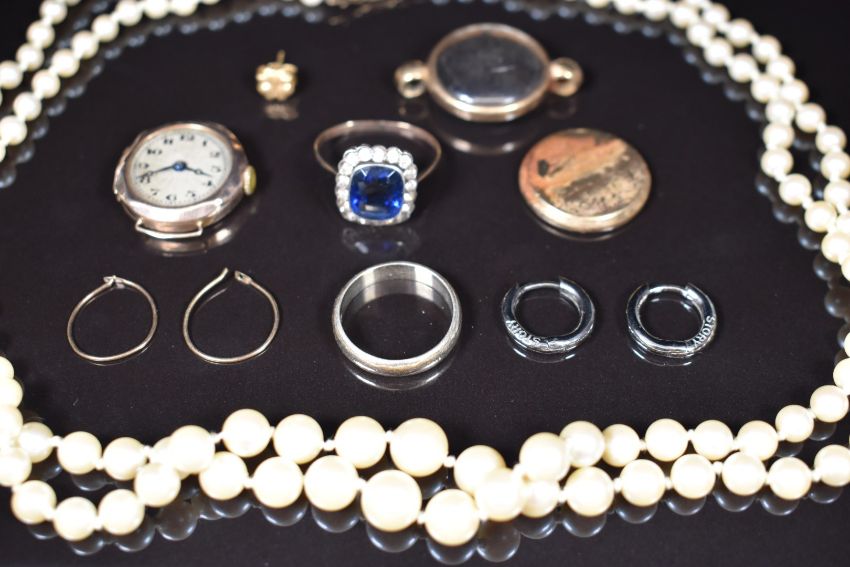 A double strand of cultured pearls with 9ct gold clasp, 9ct gold and silver ring, 9ct gold wedding band (3.2g), 9ct gold watch, 9ct gold watch back (2.2g), etc