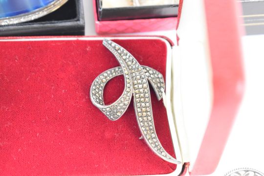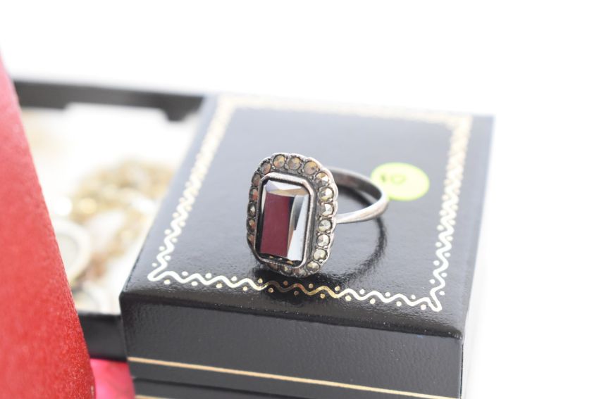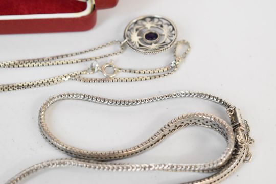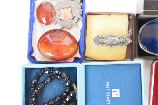 A collection of jewellery including jet necklace, silver ring set with marcasite, agate brooch, silver brooch, silver necklace, Victorian silver brooch set with blue agate, Arts & Crafts pendant, etc