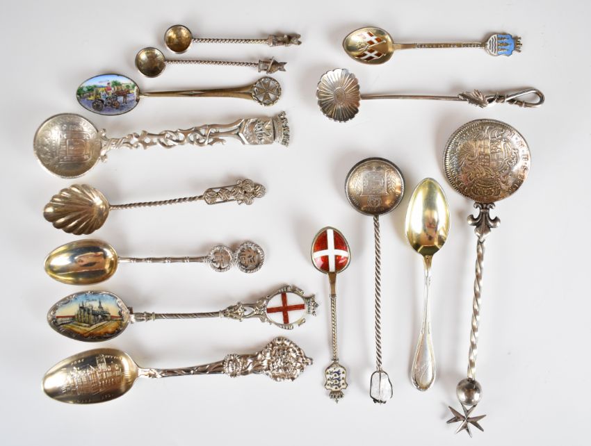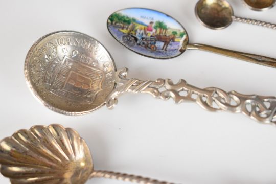 Souvenir silver and other spoons including Chinese Wang Hing, American Sterling example, 800 grade and enamel decorated examples, length of longest 16cm, weight of all items 200g