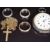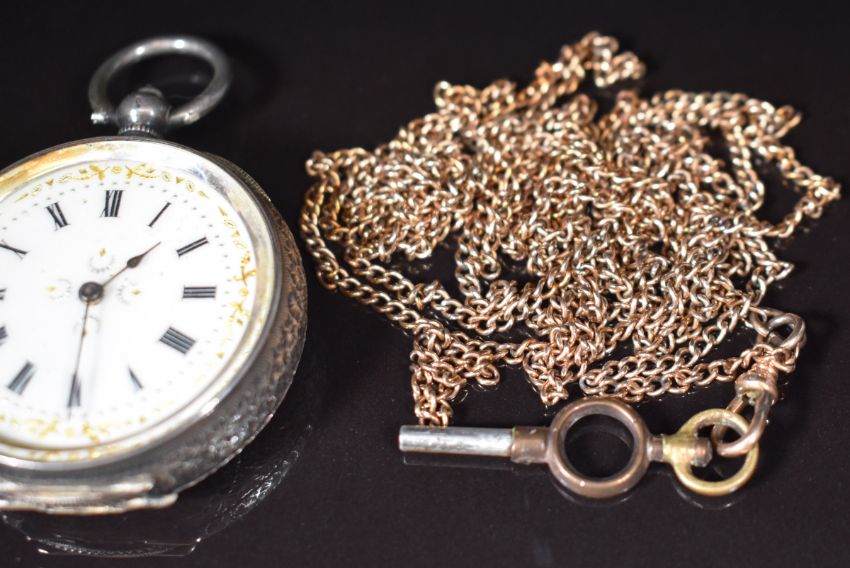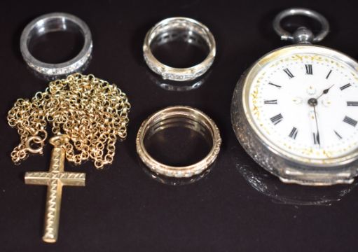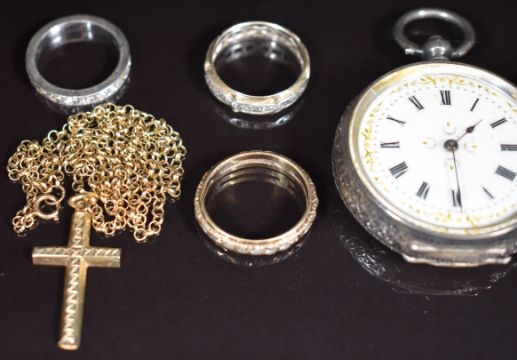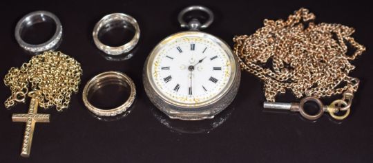 A 9ct gold cross and chain (3.6g), two 9ct gold eternity rings (4.5g), a silver ring, silver fob watch and a gold plated guard chain