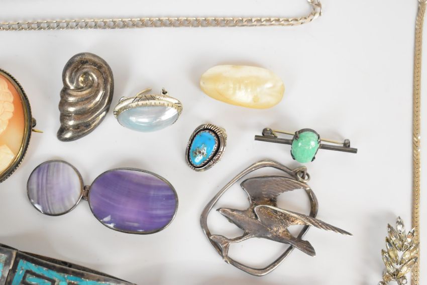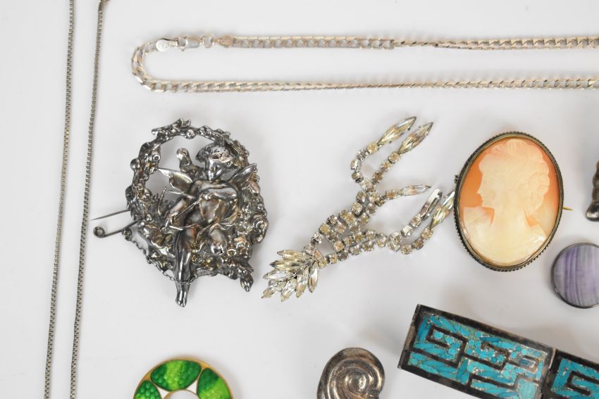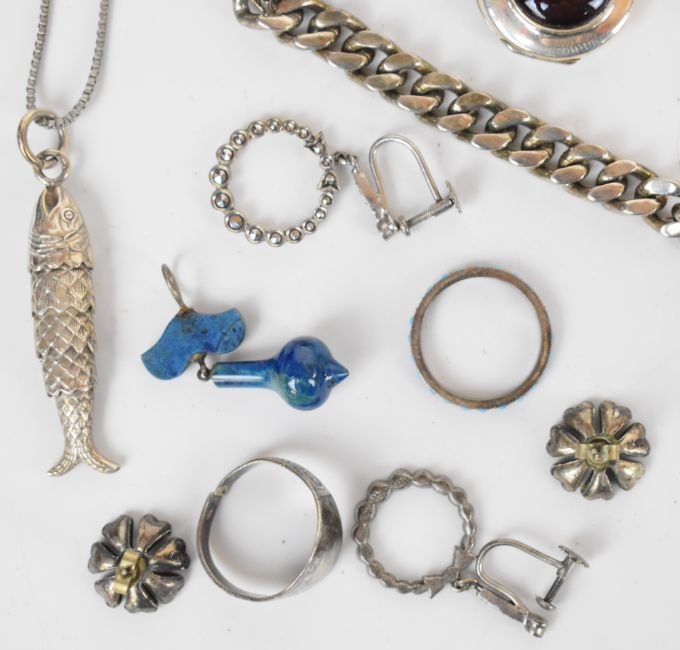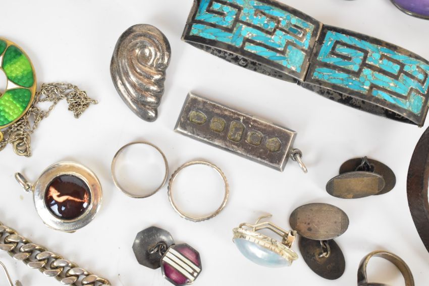 A collection of silver jewellery including earrings, rings, brooch, Mexican bracelet, pocket watch, bracelet, necklaces, ingot, etc