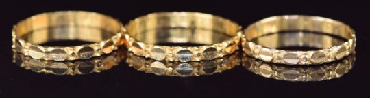 Three yellow metal rings, testing as 21k, 4.8g, size Q