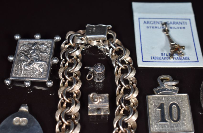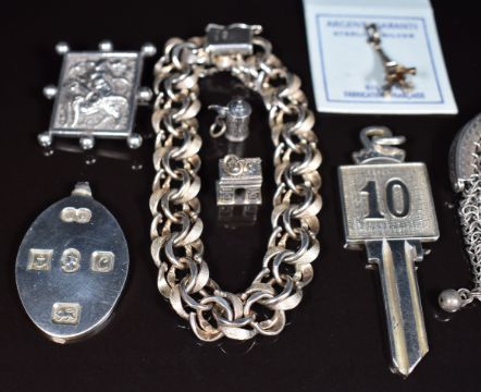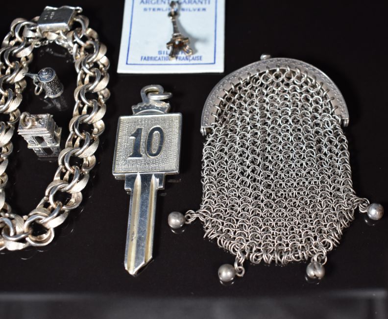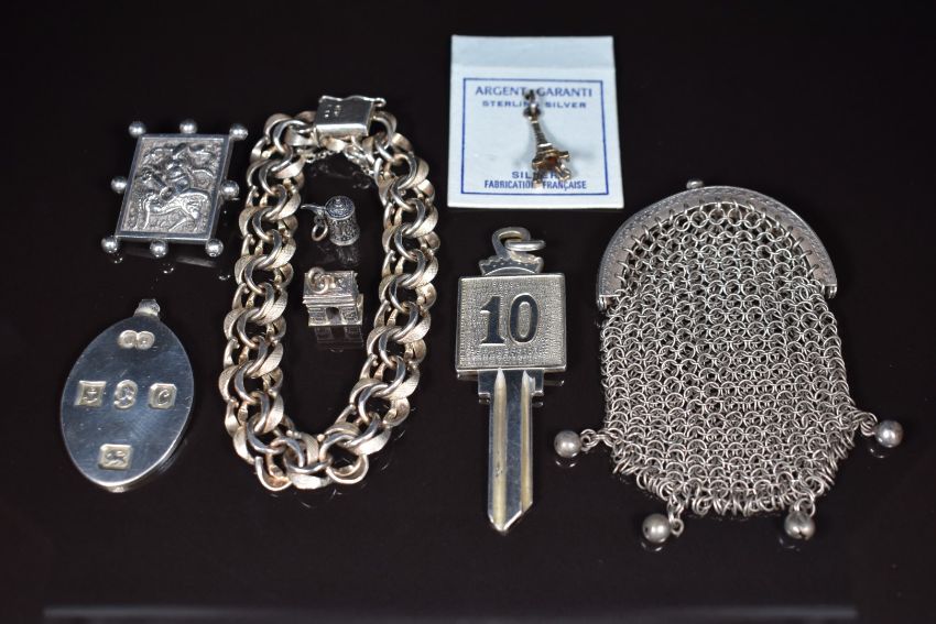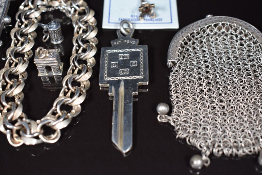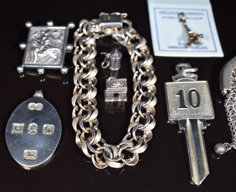 A silver bracelet made up of smooth and textured links, silver Jubilee ingot pendant, Thai silver brooch, three silver charms, white metal purse and a hallmarked silver keychain, 98g