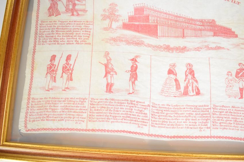 Great Exhibition Crystal Palace interest printed handkerchief or similar titled The Crystal House Which Albert Built, depicting the Crystal Palace surrounded by smaller scenes and verses, 40 x 51cm, in double sided glazed frame with gilt surround