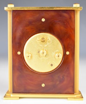 Jaeger (pre LeCoultre) Recital 8 day desk clock with alarm, black Roman numerals, silver dial and amber style and gilt metal case, 10.8cm tall.