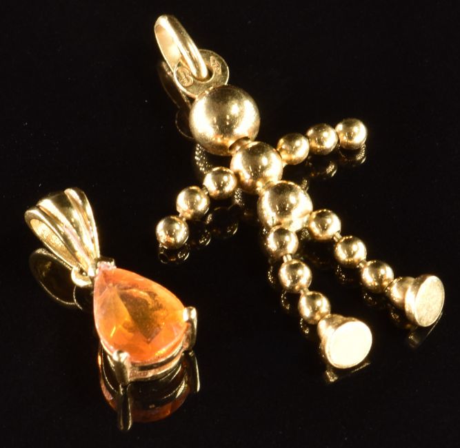 An 18k gold pendant made up of spheres in the form of a stick man by Uno A Erre (2.4g, 2.6cm), and an 18k gold pendant set with a pear cut fire opal (1g, 1.5cm)