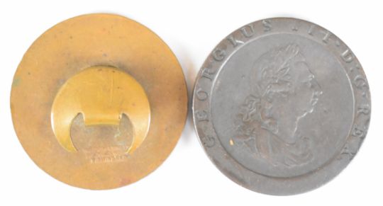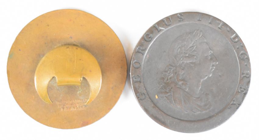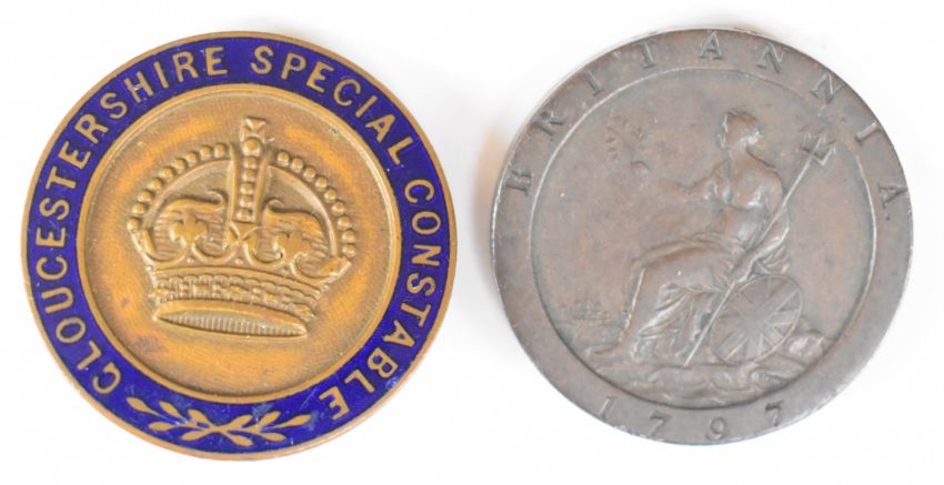 George III 1979 cartwheel penny VF, as a 'spy' secret message case, together with a Gloucestershire Constabulary badge