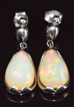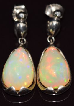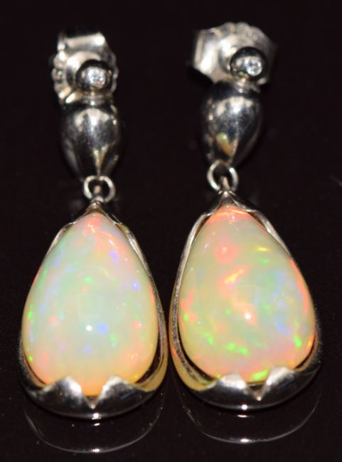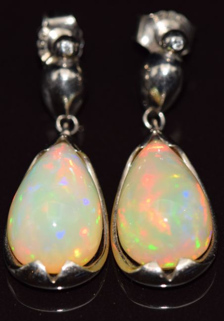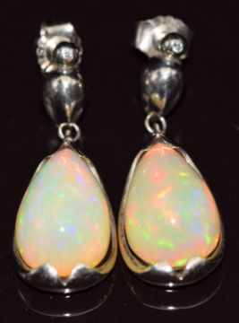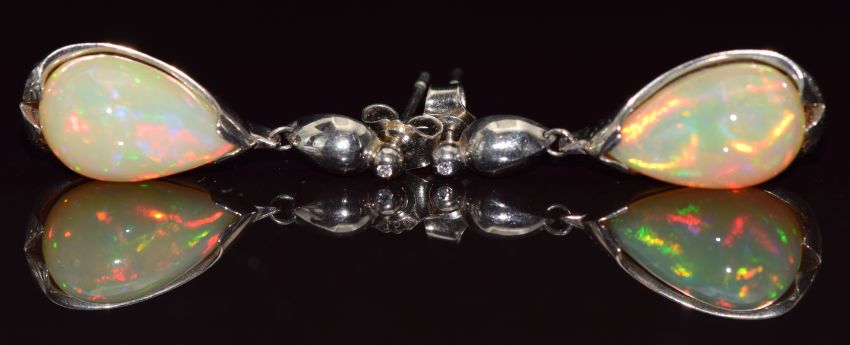 A pair of 18ct white gold earrings each set with a pear cut Ethiopian opal of approximately 9.5ct and a diamond, made by Ben Day, with original receipt for £7,500