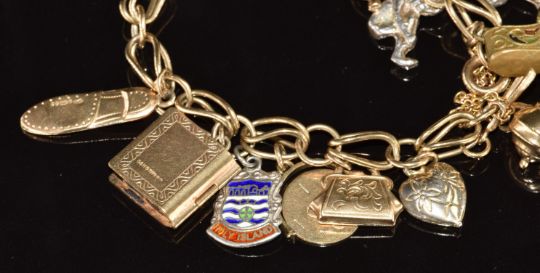 A 9ct gold charm bracelet with eleven 9ct gold charms including police helmet, shoe, bible, bag, etc (22g) and three silver charms, 17cm