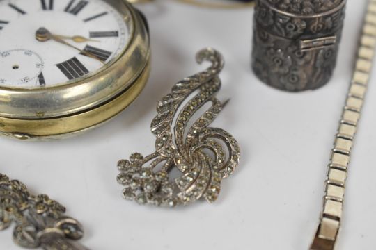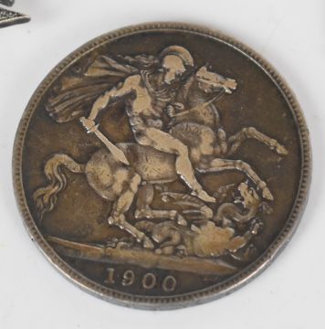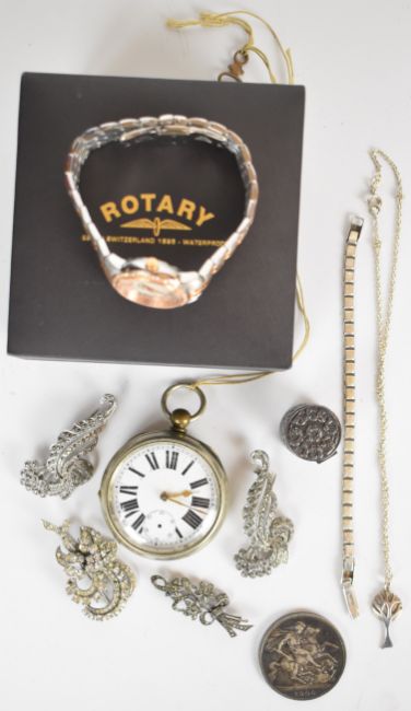 A collection of jewellery including Victorian 1900 crown, silver pot, Rotary wristwatch, silver pendant and chain, and brooches