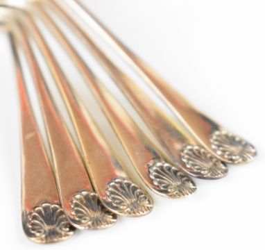 George V set of six novelty picture back coffee spoons with shell decoration and galleons to backs, Sheffield 1912, maker Thomas Bradbury & Sons Ltd, length 11cm, weight 77g