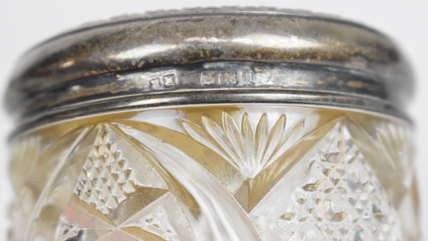 Six Victorian and later hallmarked silver mounted and lidded glass dressing table pots and bottles together with a further lid and a pair of hallmarked silver handled glove stretchers, height of tallest 9.5cm