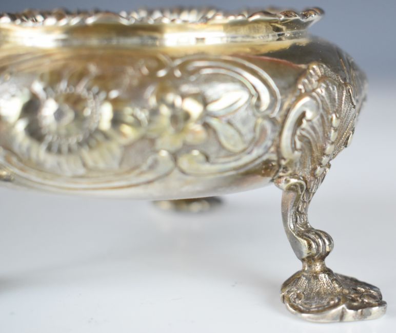 Victorian hallmarked silver open salt raised on three feet, London 1846, maker Henry Holland, diameter 10.5cm, weight 184g