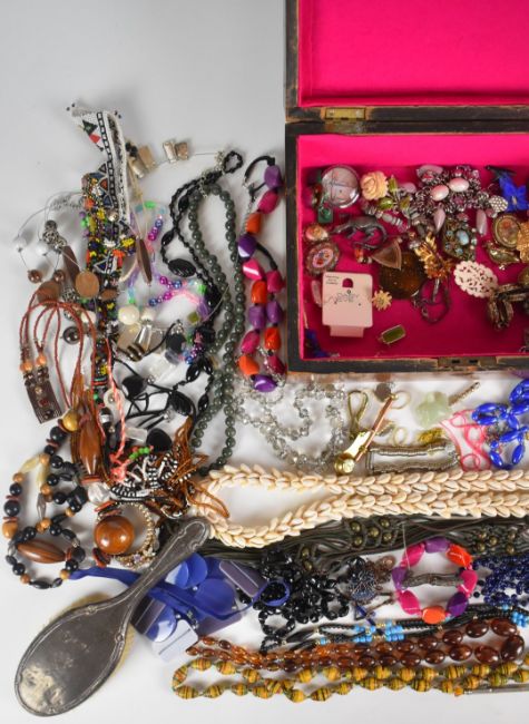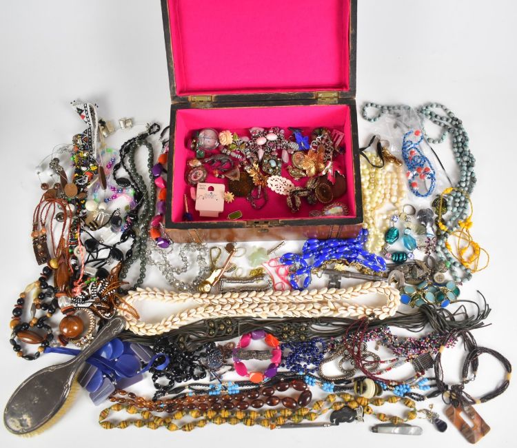 A collection of jewellery including beaded necklaces, filigree brooch, silver backed brush, Siam silver brooch, silver ring, silver pendant set with Blue John and verso malachite, 9ct gold chain (0.9g), etc