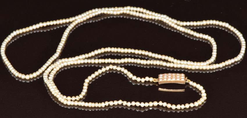 A single strand of natural pearls, the 9ct rose gold clasp set with split pearls, 90cm, 12g
