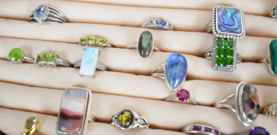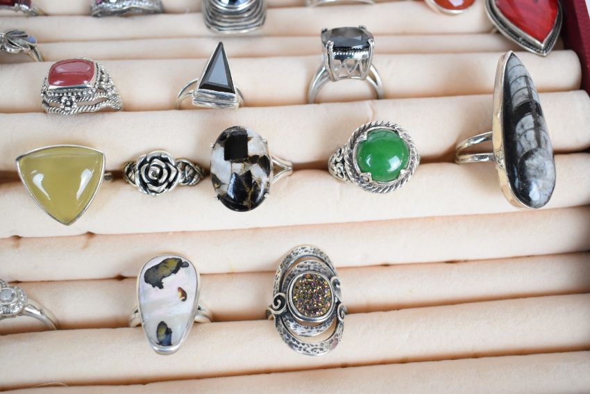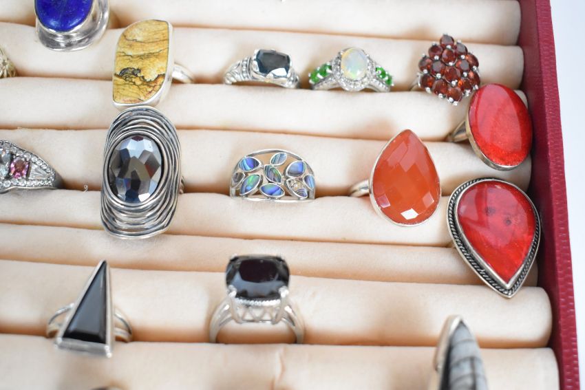Seventy silver rings including malachite, pressed amber, spinel, amethyst, opal, quartz, garnet, topaz, etc., some with certificates