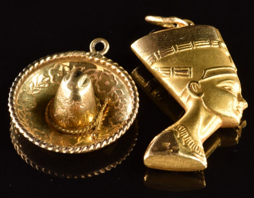 A 14k gold charm in the form a sombrero (2.2g) and an 18k gold pendant in the form of Nefertiti (10.3g)
