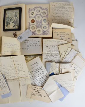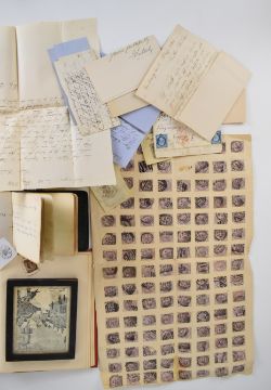 Mixed postal / social history items including 1813 Ashby De La Zouch baptism certificate for Mary Watts, French stamps on cover 1859 with associated letters, small album of missives, watercolours, etc, local pen and ink winter Friday St Minchinhampton, crests and monograms album