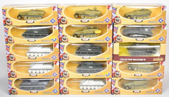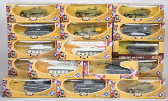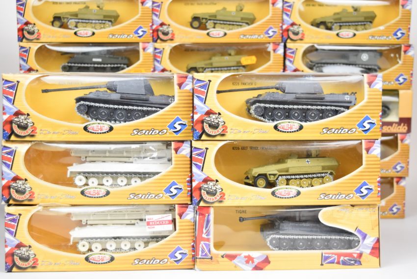 Twenty-one Solido The Famous Battles Collection 1:72 scale diecast model tanks and similar military vehicles to include 6210 Sherman, 6227 SU 100, 6226 Panther G and 6232 Govilla, all in original boxes