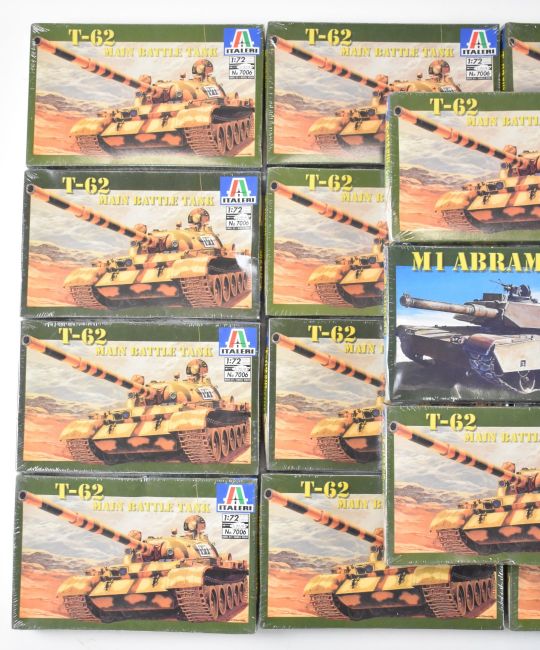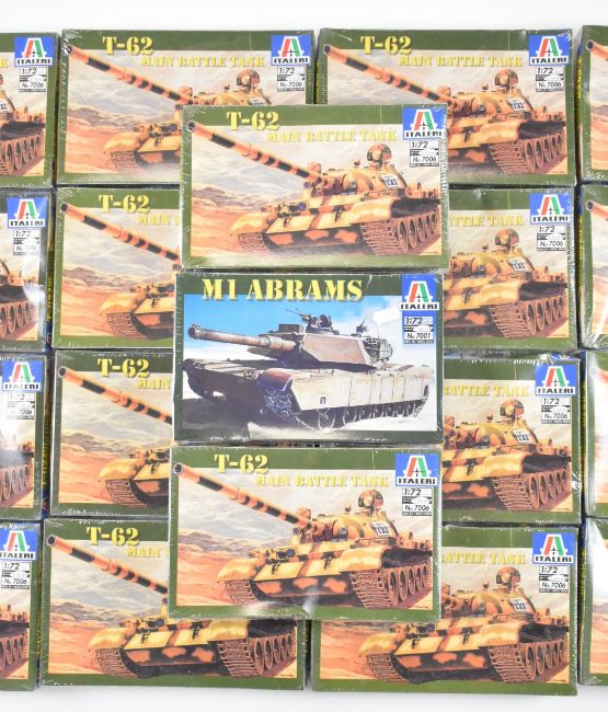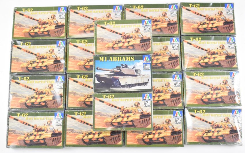 Nineteen Italeri 1:72 scale plastic model tank kits comprising T-62 Main Battle Tank 7006 and M1 Abrams 7001, all in sealed boxes.
