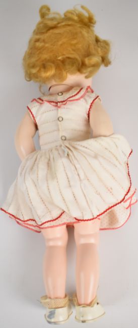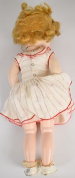 Pedigree plastic bodied doll with blonde hair, blue weighted eyes, red lips and tinted cheeks, likely Shirley Temple, height 57cm.