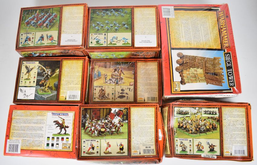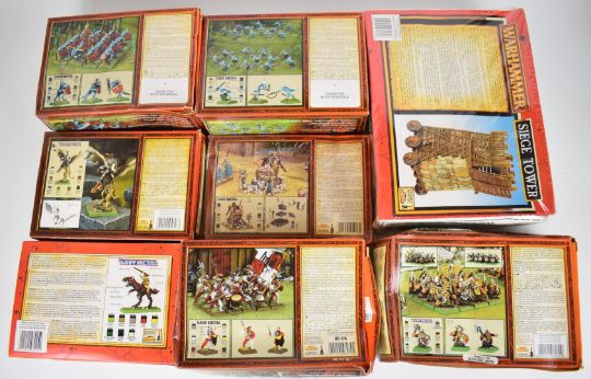 Eight Games Workshop Warhammer metal and plastic figurine boxed sets to include Lizardmen Skink Regiments, Dwarf Warriors, Tomb Kings Casket of Souls, Elector Count on Griffin and Tichi-Huichi's Raiders, all appear unused and in original boxes.