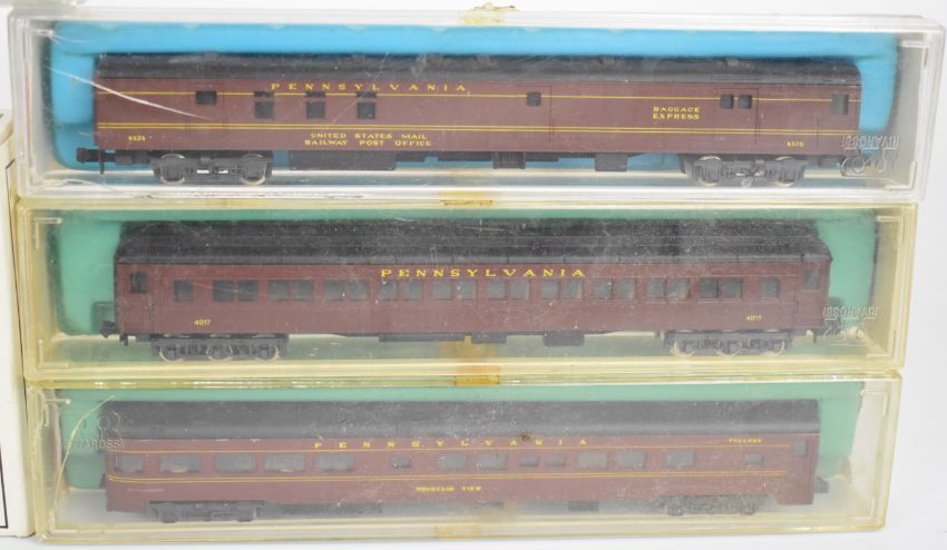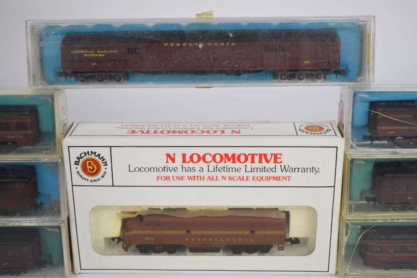 Bachmann N gauge EMD F9 Diesel Pennsylvania locomotive together with seven Atlas and Rivarossi passenger carriages, all in original boxes.