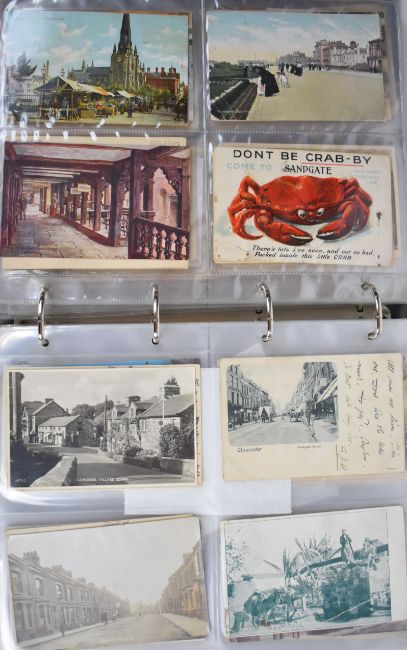 Album of Victorian, Edwardian and WW1 era postcards and postal history, from 1887 with Wandsworth, Chiswick and Wakefield postmarks, approximately thirty four silk cards, hop picking Sutton Coldfield, Bristol tramway and steamer entering dock, High St Yeovil, Salcombe, London, 'The Diver', etc, approximately 230 cards