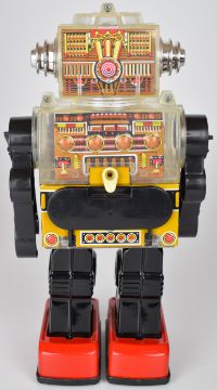 Battery operated tinplate and plastic 'Piston Robot' by SJM (Taiwan), height 28cm, in original box.