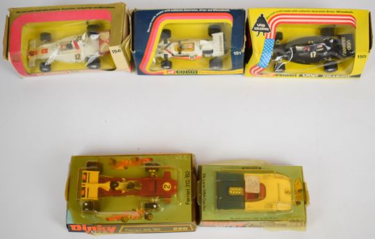 Five vintage diecast model F1 and similar racing cars comprising Corgi UOP Shadow 155, Graham Hill's Embassy Shadow 156, Yardley McLaren M19A 151, Dinky Ferrari 312 B2 226 and McLaren M8A Can Am 223, all in original boxes.