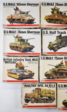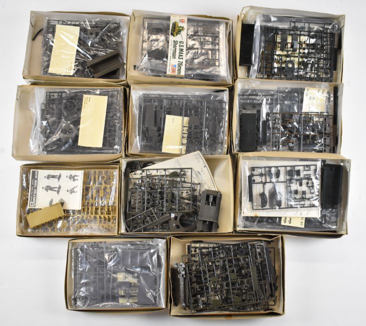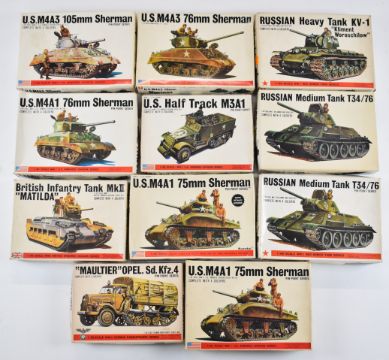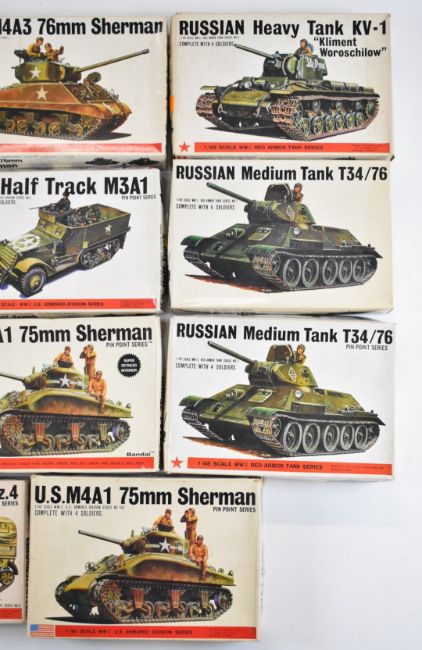 Eleven Bandai 1:48 scale plastic model WW1 military vehicle kits to include US M4A3 105mm Sherman Tank, Russian Heavy Tank KV-1 and British Infantry Tank MkII 'Matilda', all in original boxes with contents in sealed bags.