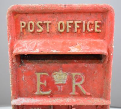 Elizabeth II cast iron and steel post box with enamel plate to front giving collection times, overall height 62cm