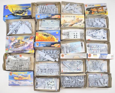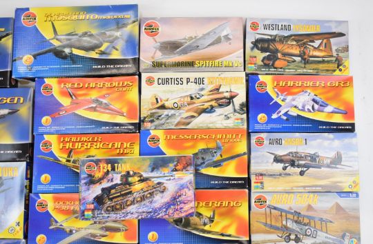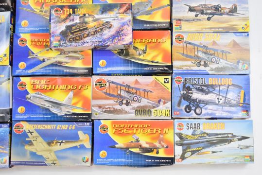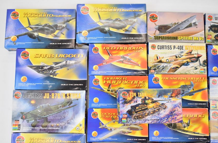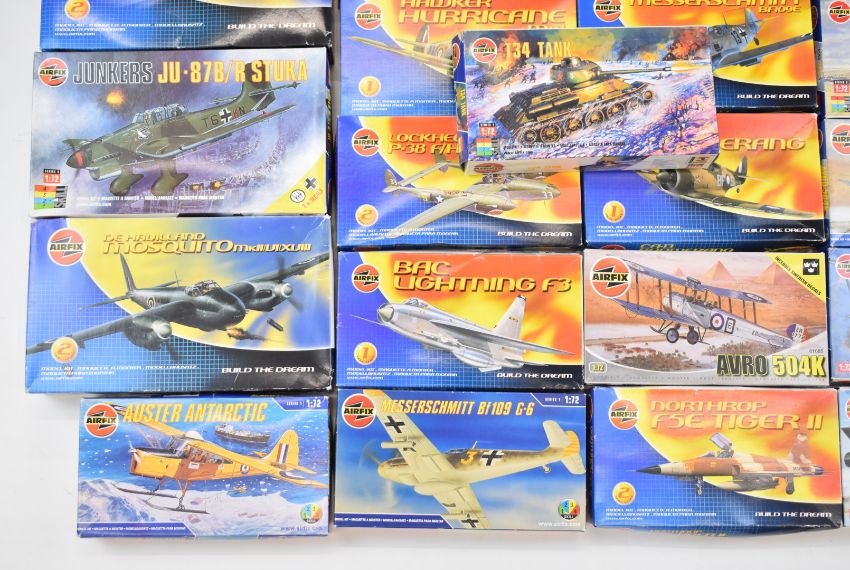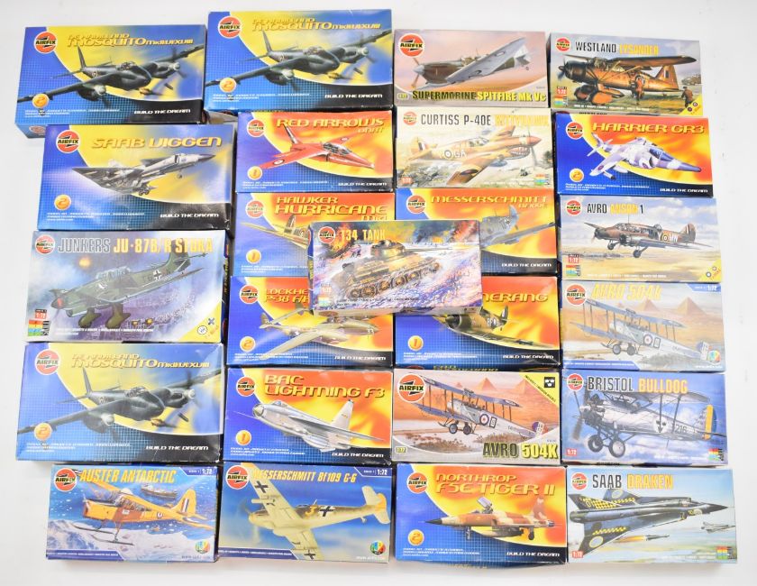 Twenty-four AIrfix 1:72 scale plastic model aircraft kits to include Red Arrows Gnat 01036, Hawker Hurricane Mk1 02082, Harrier GR3 02072, Saab Draken 02039, Bristol Bulldog 01083 and Avro 504K 01048, all in original boxes.