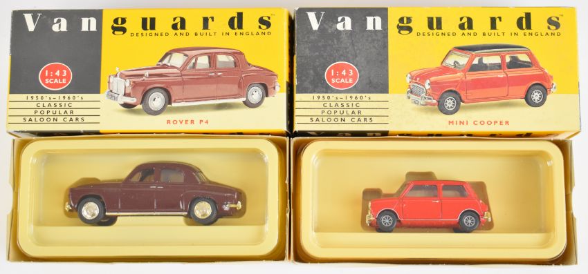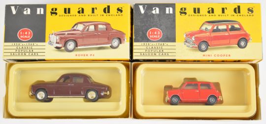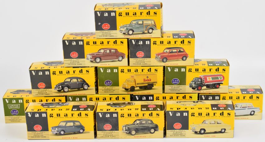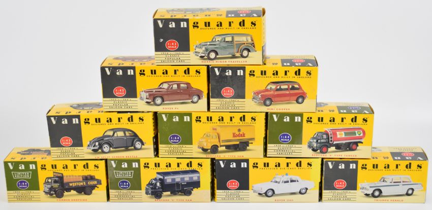 Thirteen Lledo Vanguards diecast model cars and trucks to include Maroon Rover VA19000, Red/Black Mini Cooper VA25000, Black Beetle VA12001 and Grey Triumph Herald VA5005, all in original boxes.