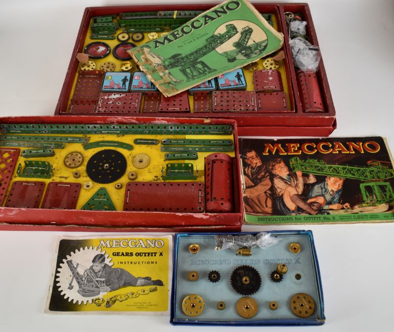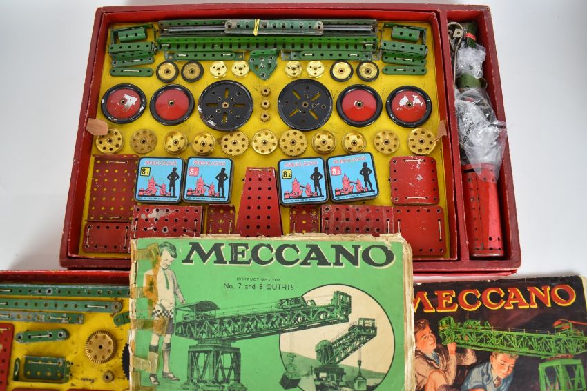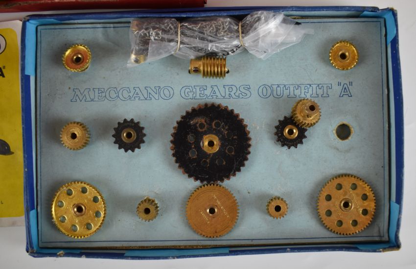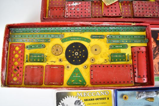 Three Meccano sets comprising numbers 8, 8A and Gears Outfit A, all appear complete and boxed with instructions.