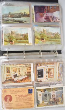 Album of vintage postcards, mainly pre 1930s topographical, many Oilette style cards including Dartmouth, Falmouth, Harrogate, Evesham and surrounding area, Sidmouth, Guildford, Dunster, Broadway, Lyme Regis, Chepstow, Ross market place, York, ocean liner at Queenstown, series of Harry Payne cards, Windsor Castle, Queen's Doll's House series, Edwardian scenes Torquay, Ledbury, Wolverhampton, Hull, Warwick, hop picking, some humorous including Bamforth and two Mabel Lucie Attwell, approximately 300 cards