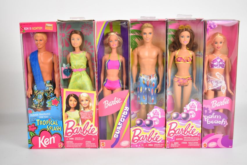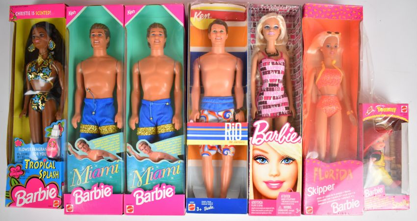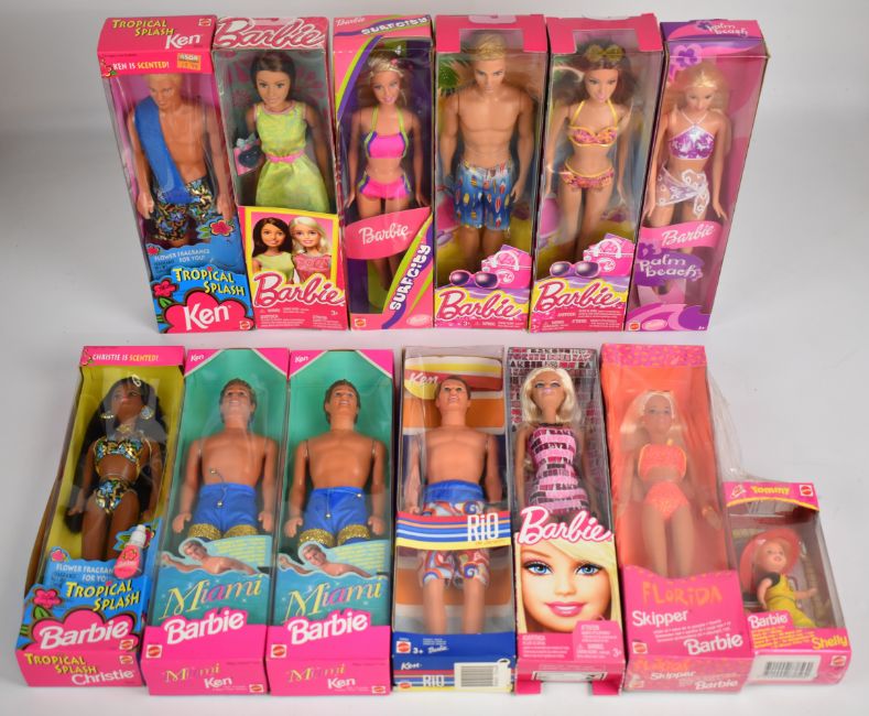 Twelve Mattel Barbie dolls dating to the 1990's and 00's to include Palm Beach 53457, Miami Ken 16170, Surf City 28417 and Tropical Splash Christie12451, all in original boxes.