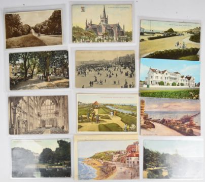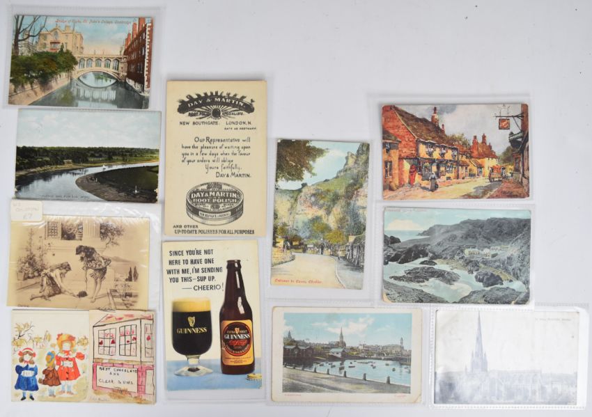 Large case of postcards, deceased dealer's stock, unsorted but in categories including Isle of Wight, Gloucestershire, Dorset, Cheshire, Cornwall, Cambridgeshire, Channel Islands, Buckinghamshire, Bristol, Avon, Advertising, Animals, Guinness, in fitted case