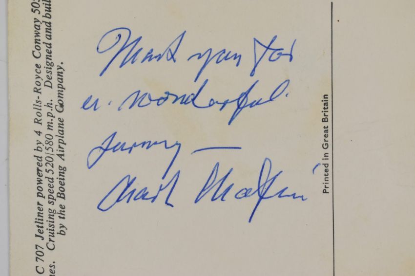 Charlie Chaplin (1889-1977) autographed postcard, signed 'Thank you for a wonderful journey, Charles Chaplin' in blue ink. Obtained by a long serving Cabin Service Director for British Airways in the 1970's