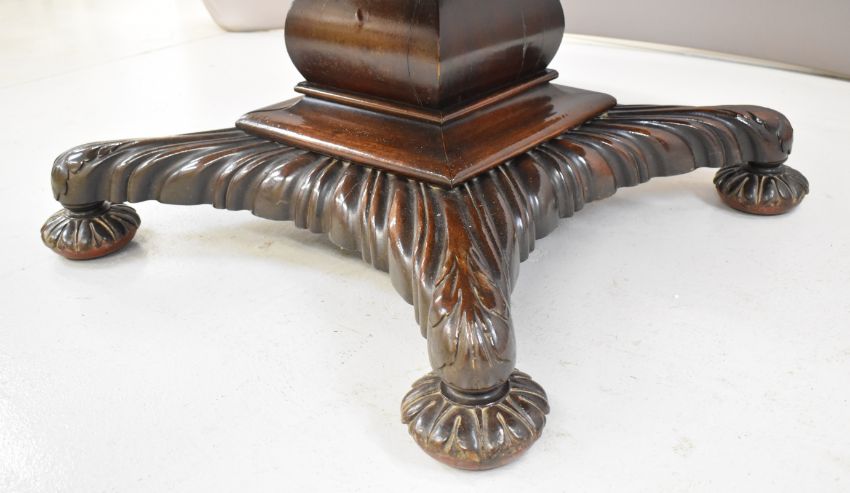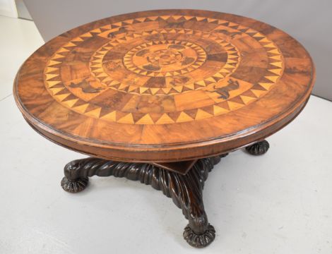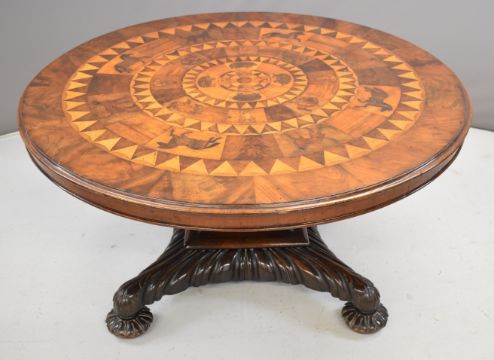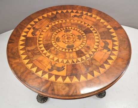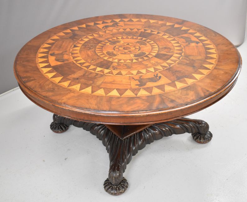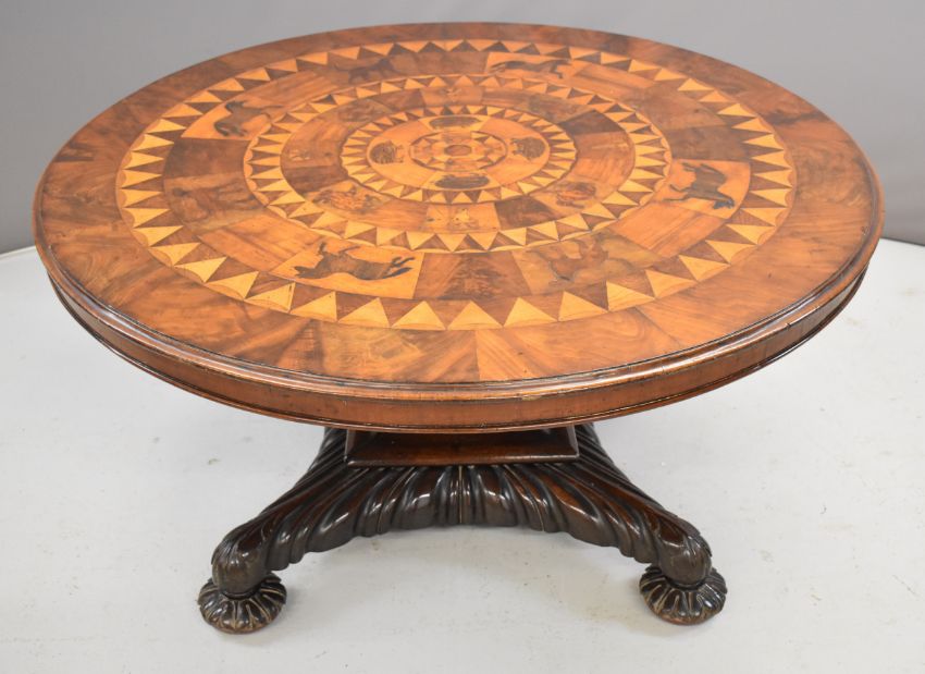 19thC parquetry and marquetry fruitwood, mahogany and specimen wood hall table with inlaid animals including hedgehogs, hares, dogs and horses, raised on a quatrefoil base, diameter 138cm, height 67cm