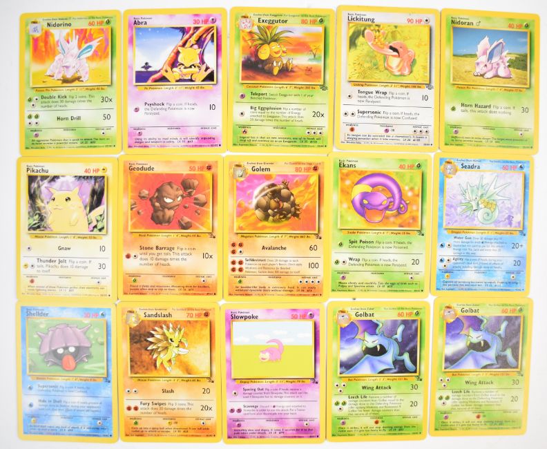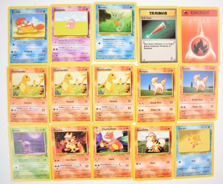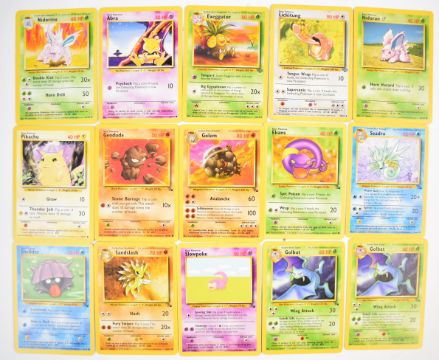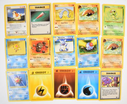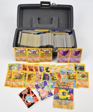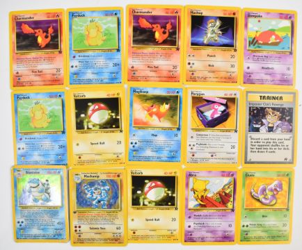 Approximately 700 Pokémon cards from Base, Jungle, Fossil, Base 2 and Rocket sets together with a stock of energy cards and 37 Holos including Blastoise, Alakazam, Zapdos, Kabutops, Muk, Mewtwo, Machamp, Raichu, Rocket Trainer, Dark Hypno, Dark Alakazam, Dark Raichu and Dark Machamp. Wizards of the Coast (1999) (1999-2000)
